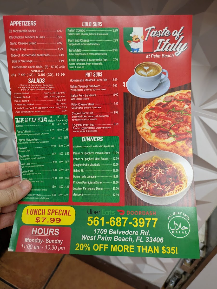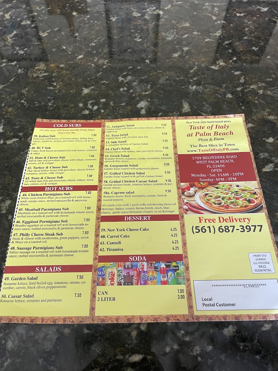 Welcome to Taste of Italy - West Palm Beach, a hidden gem located at 1709 Belvedere Rd. This charming eatery invites you to indulge in authentic Italian flavors that transport you straight to the heart of Italy.